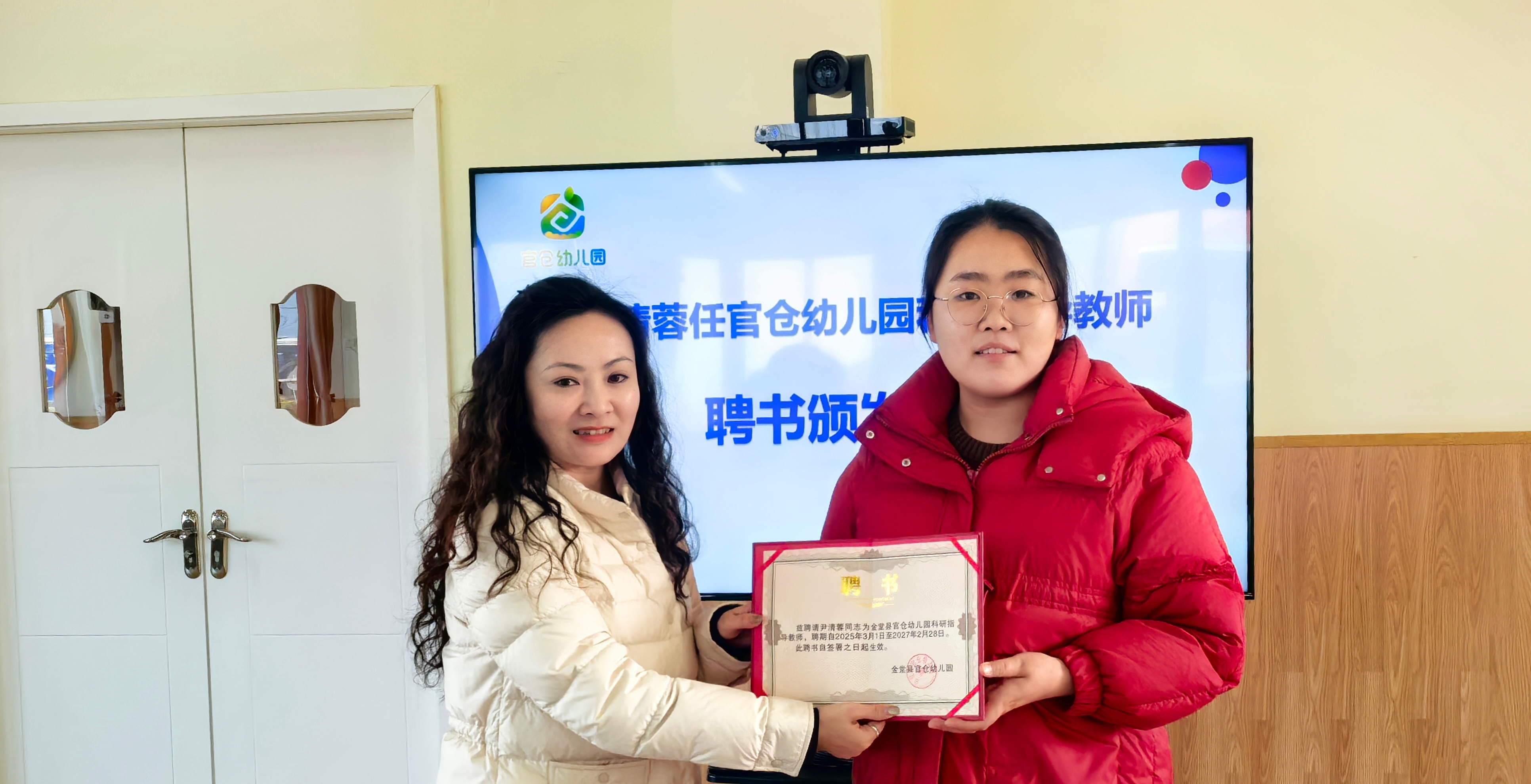 会议伊始,官仓幼儿园聘任尹清蓉为科研指导老师,张凤园长为其颁发聘书。