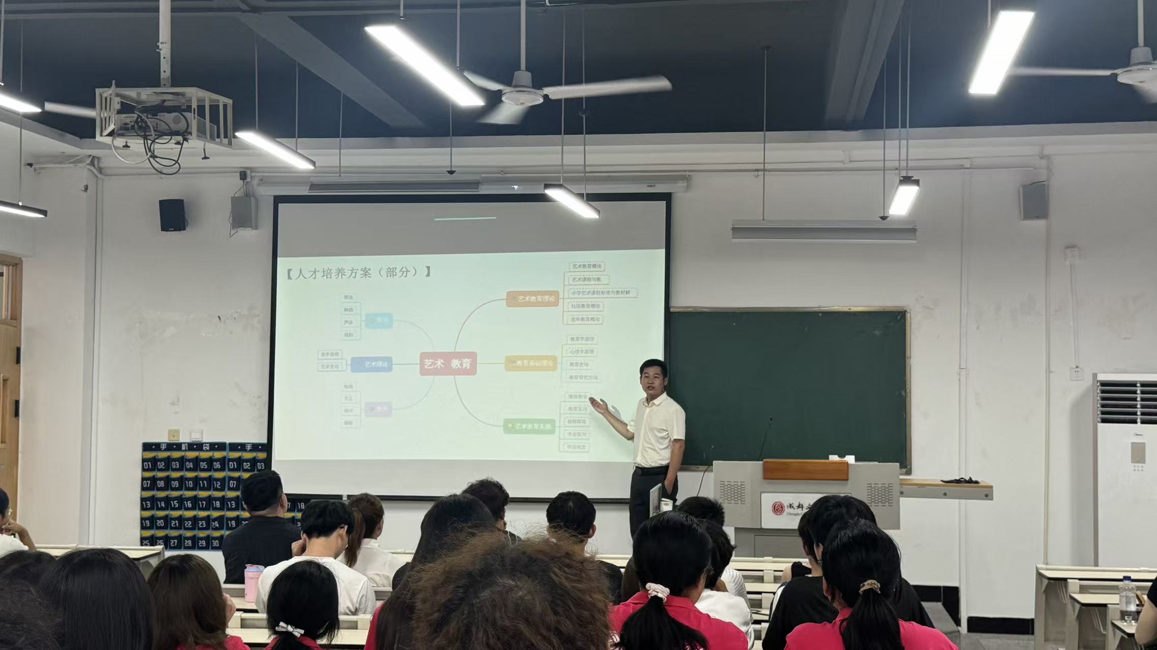 介绍会以“以美育人,向美而行”为主题,林雪老师从国家美育政策、专业培养目标、课程体系及未来职业发展等方面进行了深入阐释。他引用孔子“成于乐”与艾斯纳对艺术价值的阐释,强调艺术教育在人格塑造与社会美育传播中的重要作用。