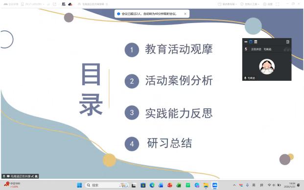 为总结教育研习成果、深化教育认知,促进师范生专业成长,2026年1月23日,3044永利集团2022级学前教育本科教育研习汇报分享会顺利召开。本次会议由学前专职教师吴胜、杨紫萱全程指导,全体教育研习生齐聚云端,共同分享教育研习感悟、交流研习收获。