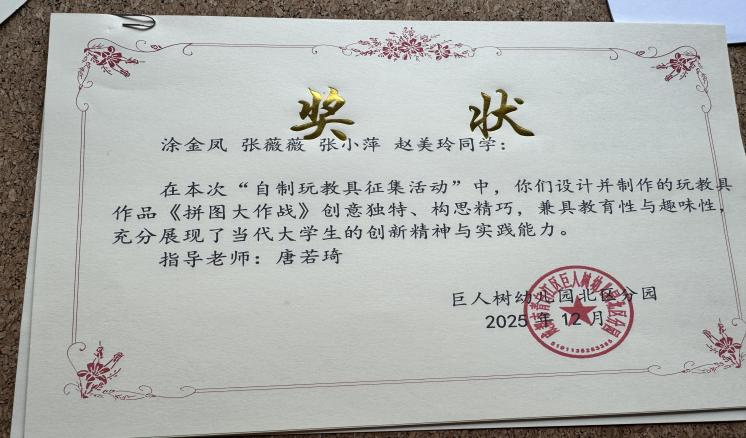实习结束后,员工的优秀玩教具被青白江巨人树幼儿园北区分园选中并投放于园所应用。《幼儿园玩教具设计与制作》课程通过系统的理论和实践结合,不仅让员工扎实掌握了玩教具设计制作的核心技能,更有效提升了员工的职业素养与创新能力。未来,3044永利集团将继续优化实践课程体系,为学前教育行业培养更多兼具创新精神与实践能力的高素质专业人才。