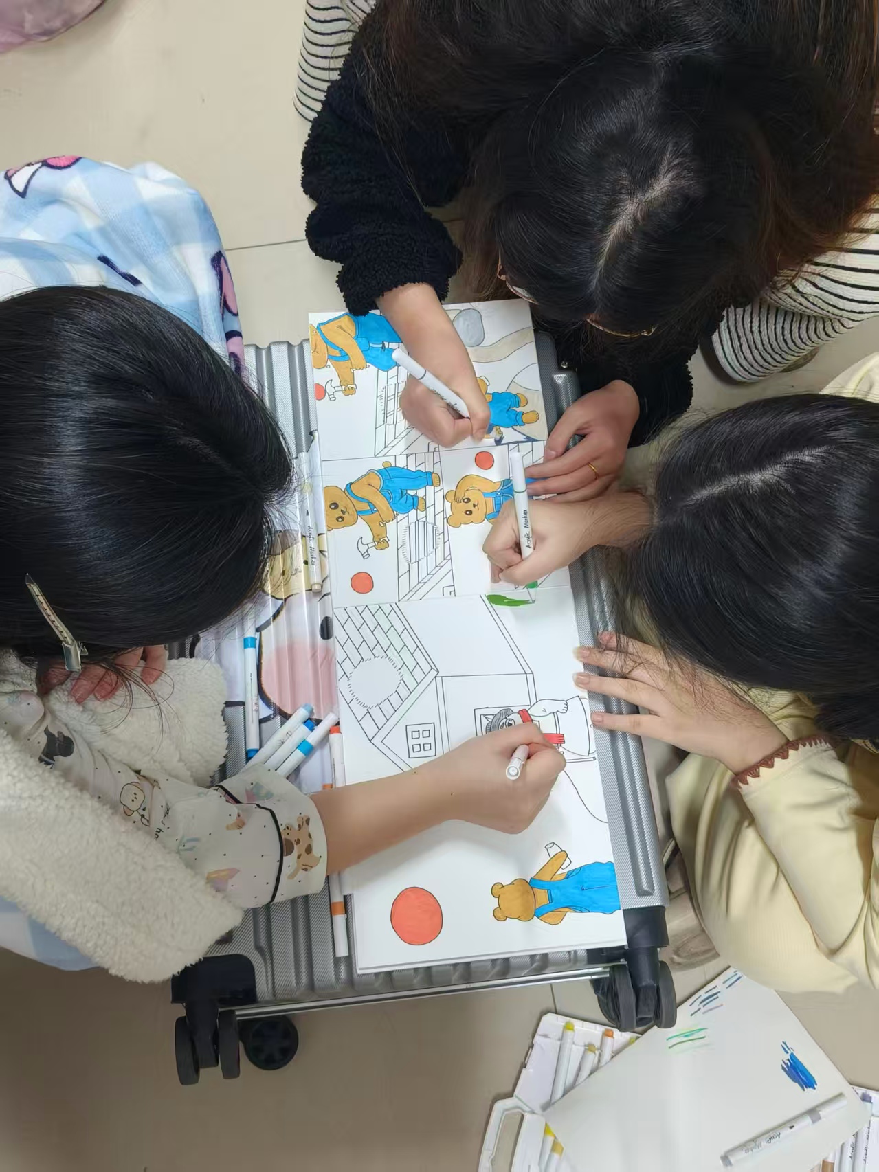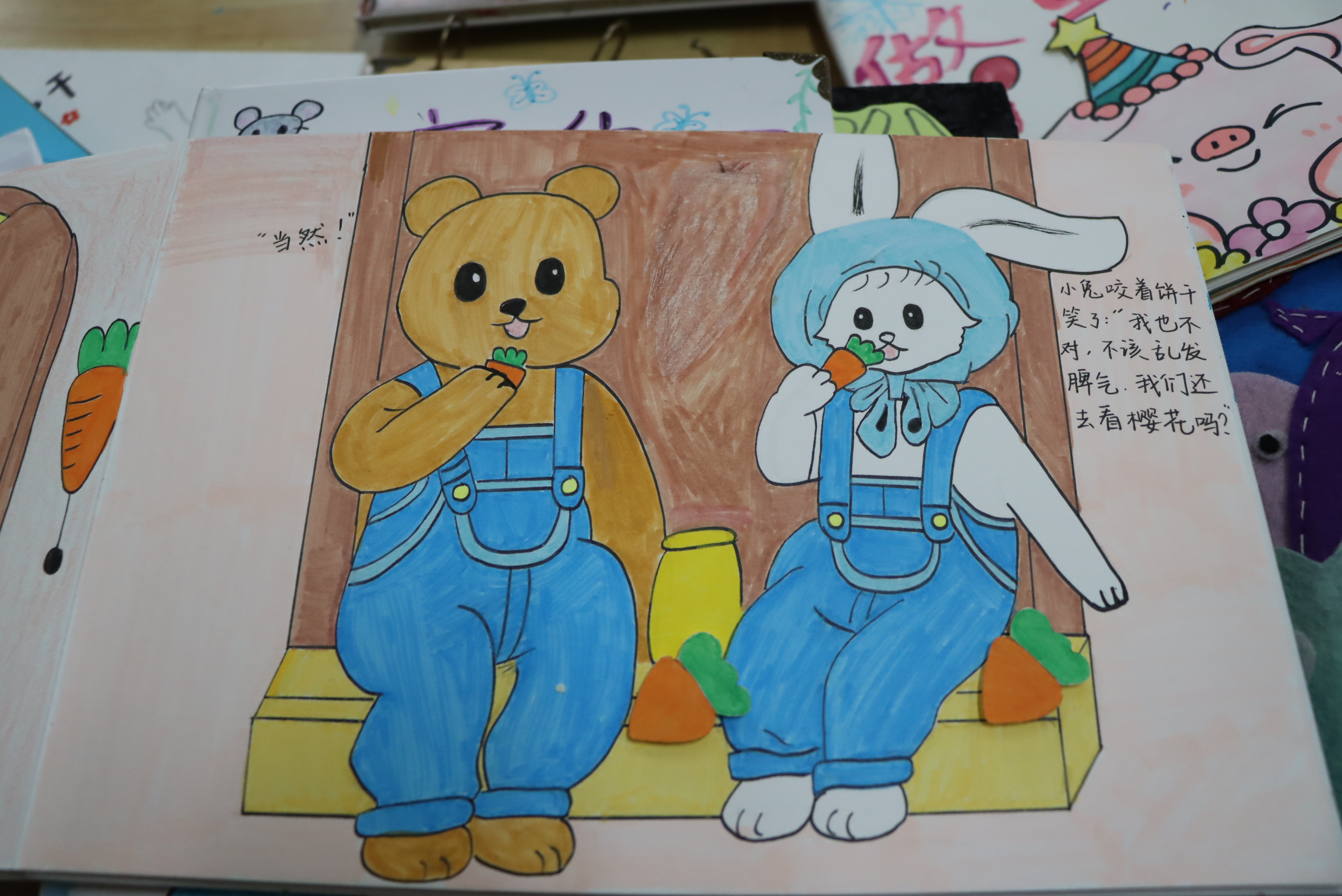 实体绘本制作是本次实习课程的核心亮点与重点环节。在指导老师的专业引领下,同学们全程亲自动手,完成选材、绘画、裁剪、装订等全流程操作,将抽象的文字故事转化为可触摸、可翻阅的实体绘本。创作过程中,同学们对每一处细节都精益求精:从纸张材质的筛选适配,到色彩搭配的童趣化设计;从插画风格的统一协调,到文字排版的简洁易懂,均充分考量幼儿审美喜好与阅读习惯。大家各展所长,创新运用多种创作形式——水彩绘画营造柔和治愈的画面氛围,剪贴画工艺打造立体生动的角色形象,数字绘画技术兼顾画面质感与创作效率,在实践中锤炼了审美能力与手工技艺,更深刻领悟了幼儿绘本作为视觉化文学载体的独特教育价值。